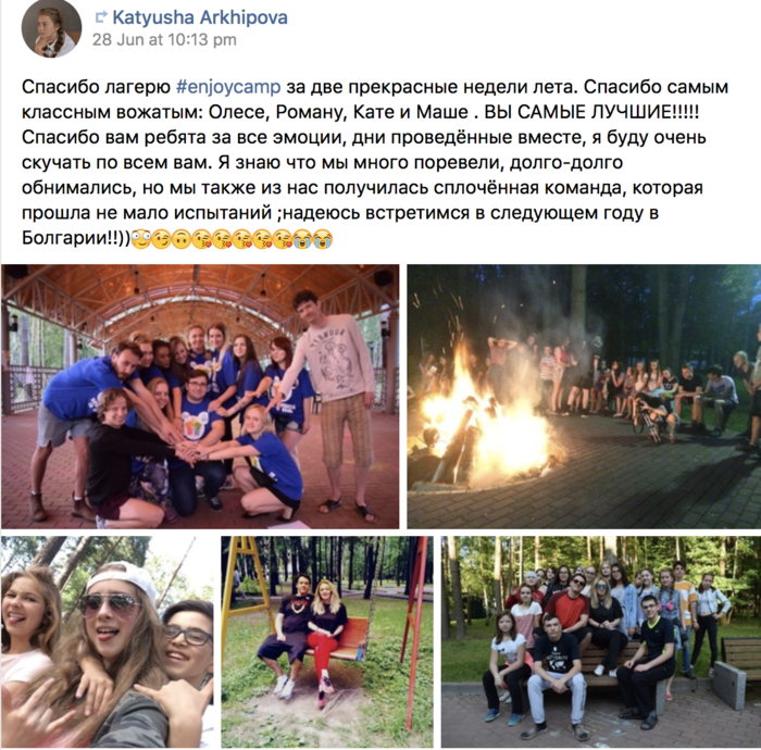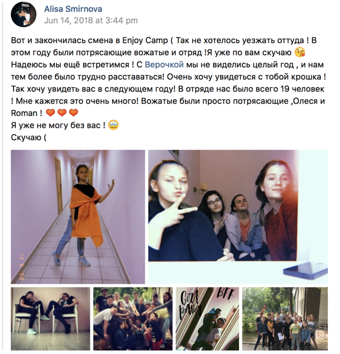 Enjoy Dance - место, куда хочется вернуться. И не только детям. Профессиональный и сплочённый рабочий коллектив в совокупности с задорными и креативными детьми создают потрясающую атмосферу, наполненную уютом и бесконечными смешными историями. Именно поэтому, побывав на 6 сменах, я уже жду новых смен , когда я смогу встретиться со своими уже "старыми" друзьями.